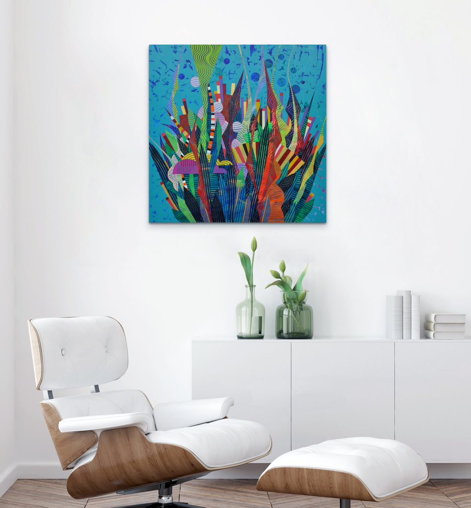 36" x 36" x 1.5" stretched canvas on wooden frame with black painted sides.