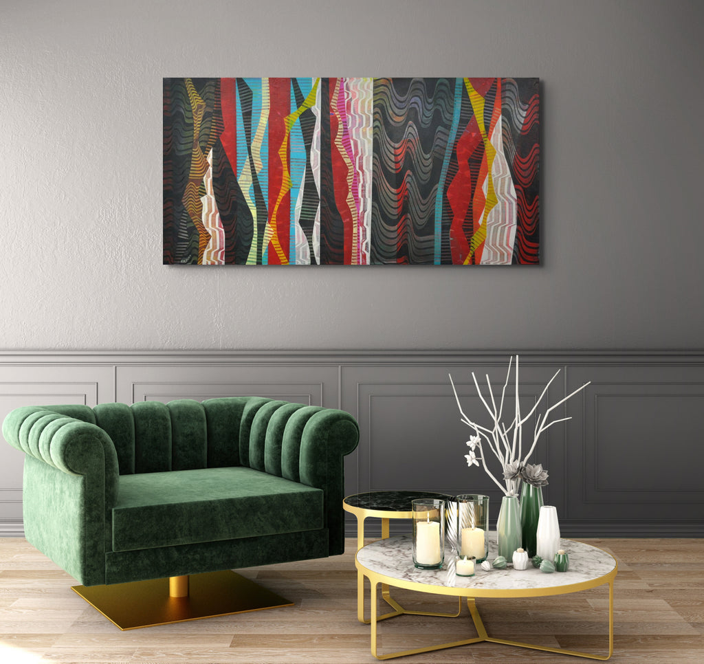 Original acrylic painting with expressive undulating lines, rich vibrant colours, and interesting details emerging from different layers of paints. The painting expresses the strong life force within us.