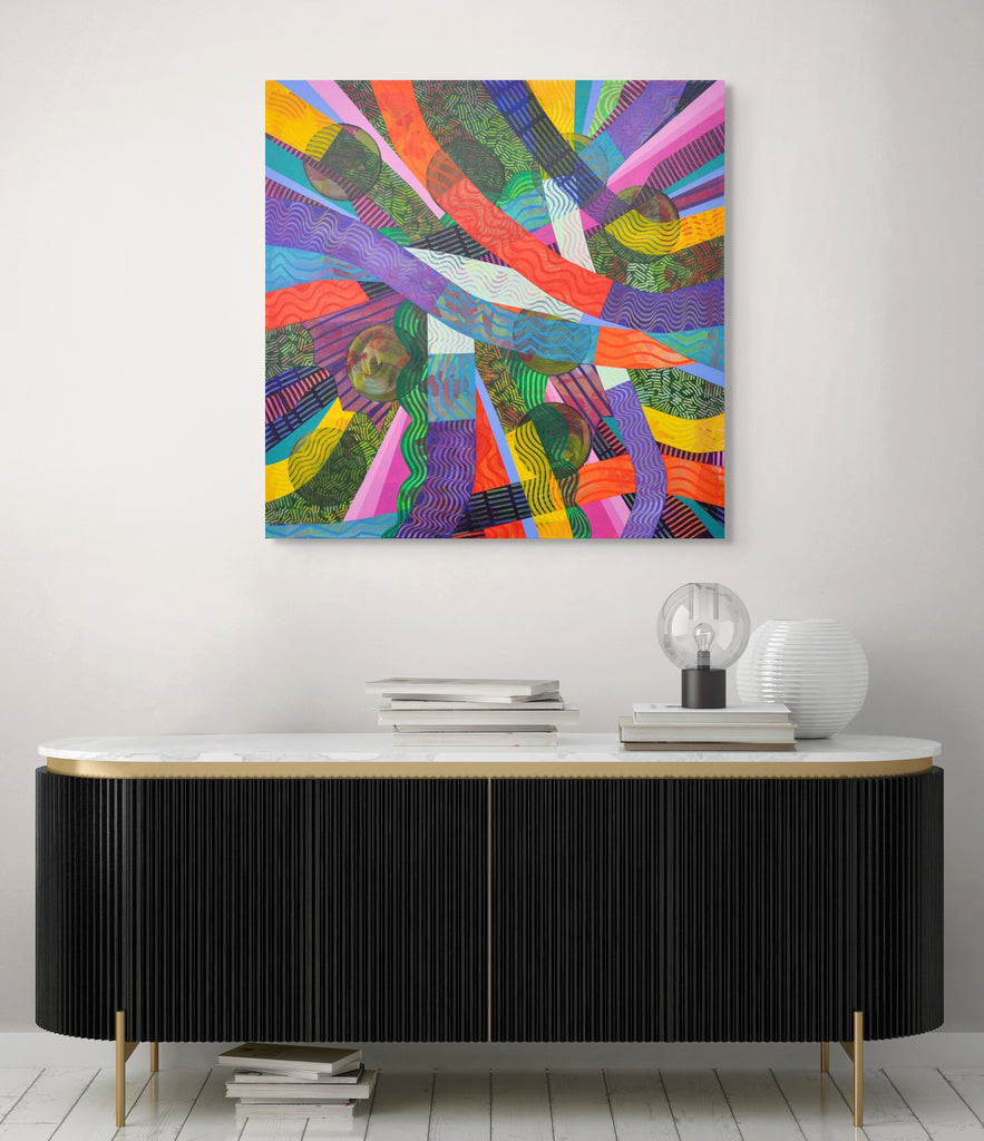 36" x 36" x 1.5" stretched canvas on wooden frame with black painted sides.