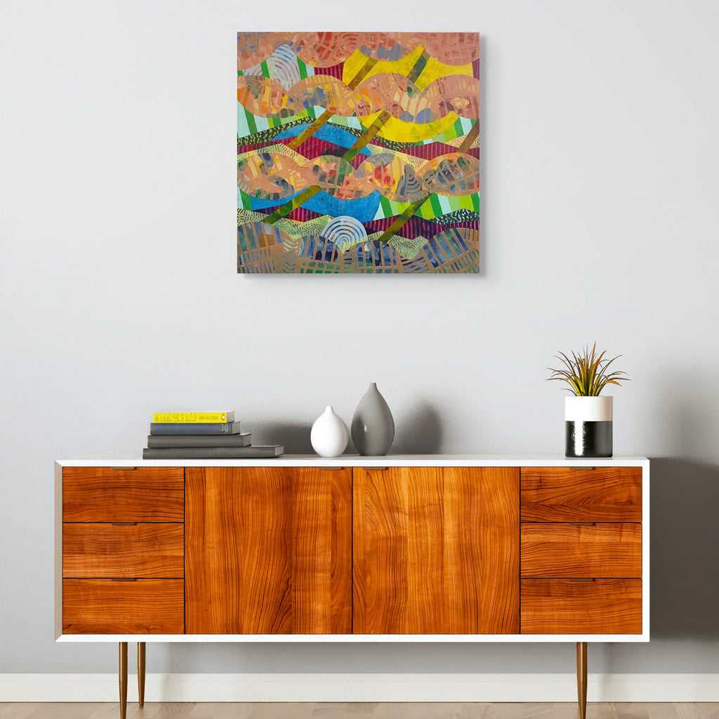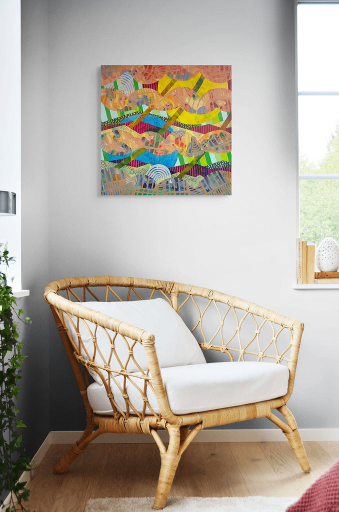 24" x 24" x 1.5" stretched canvas with black painted sides.